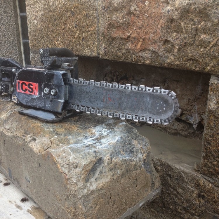The next method tried was a diamond chain saw with blades to suit the depth of cut required. EC Hopkins Ltd, the UK master distributors of ICS based in Birmingham, attended site to carry out the trial cut using the ICS 880 Hydraulic Chainsaw, powered by an EC Hopkins 3 phase power pack. The first ashlar was removed in under 30 minutes. The cut was clean, easy to control and fast making it a major improvement over any other method.