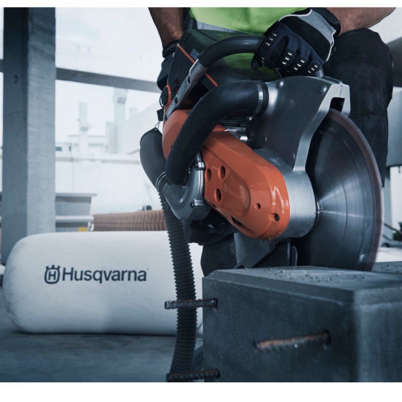 This lightweight power cutter and has many of the proven qualities of the standard K 770 while adding the benefit of dust extraction. The Husqvarana K 770 Dry is equipped with an integrated fan housing and the strong airflow (100 cfm) effectively removes the dust and transports it to the reusable bag where it’s kept contained thanks to the integrated nozzle. The large and durable reusable bag is included with the saw. The K770 Dry has an impressive maximum cutting depth of 122 mm, very close to that of a standard 350mm (14″) machine.