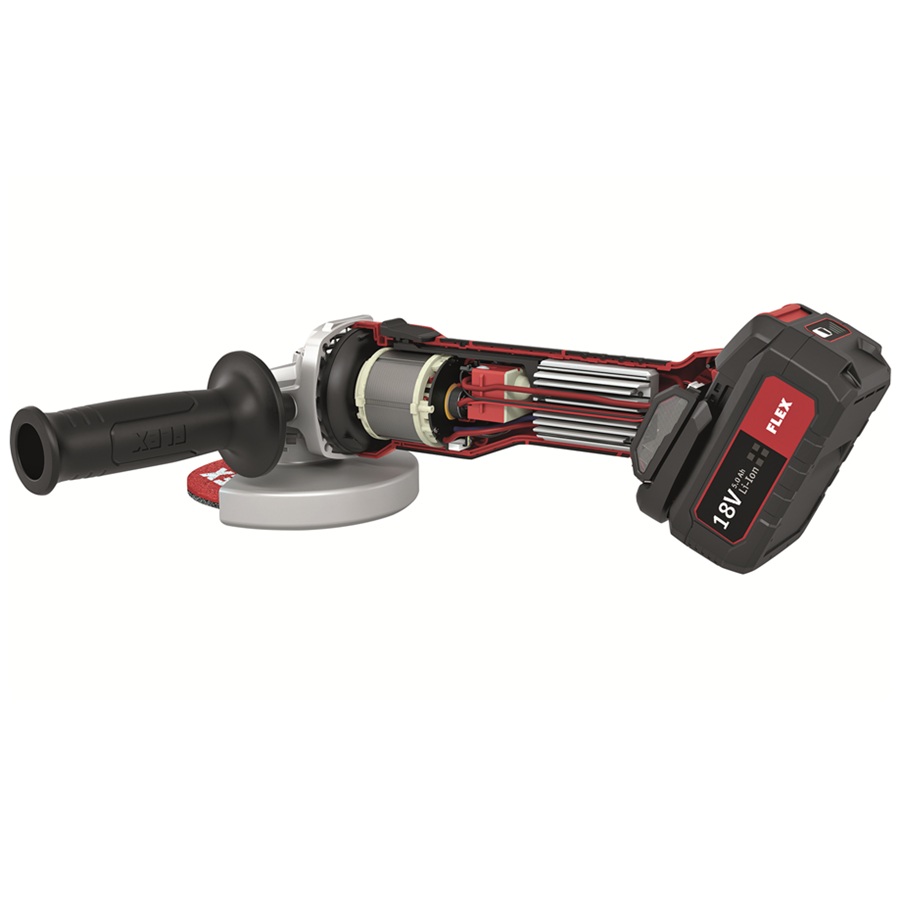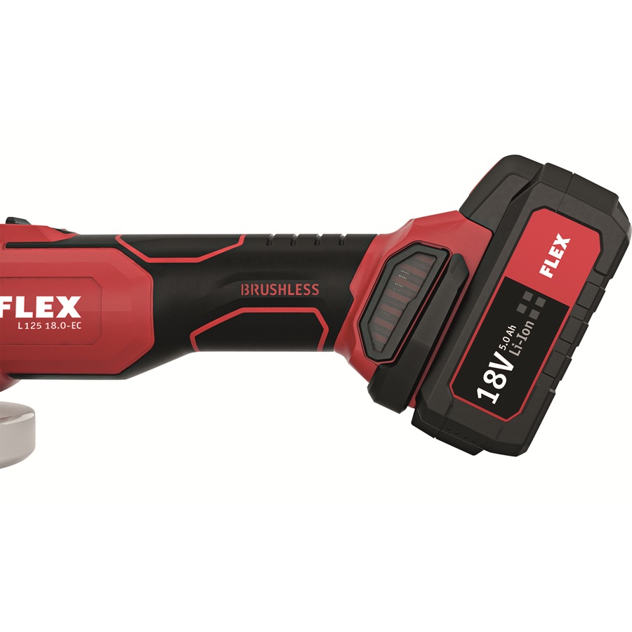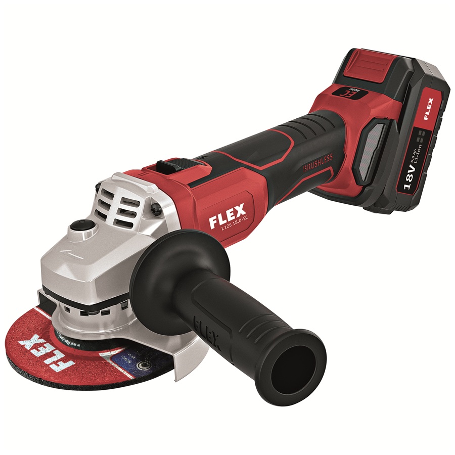 The Flex L 125 18.0-EC LD C Light Duty Cordless Angle Grinder with brushless motor. Streamlines handle section with soft grip inlays for perfect handling.