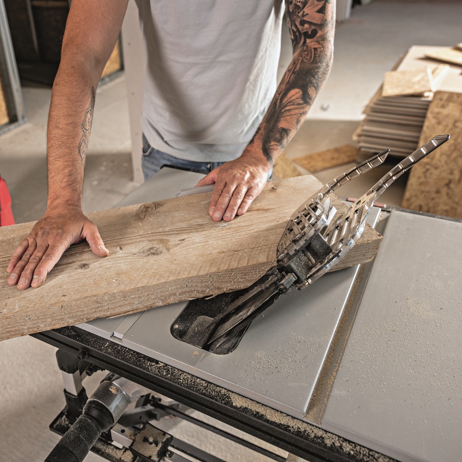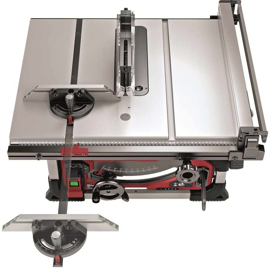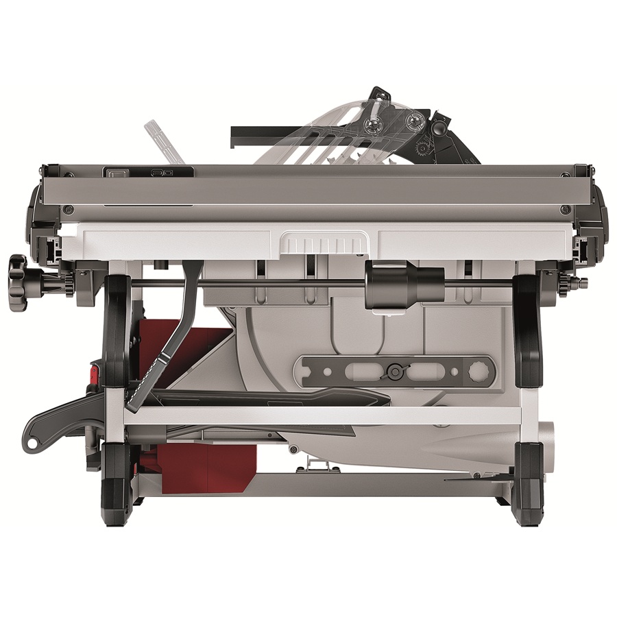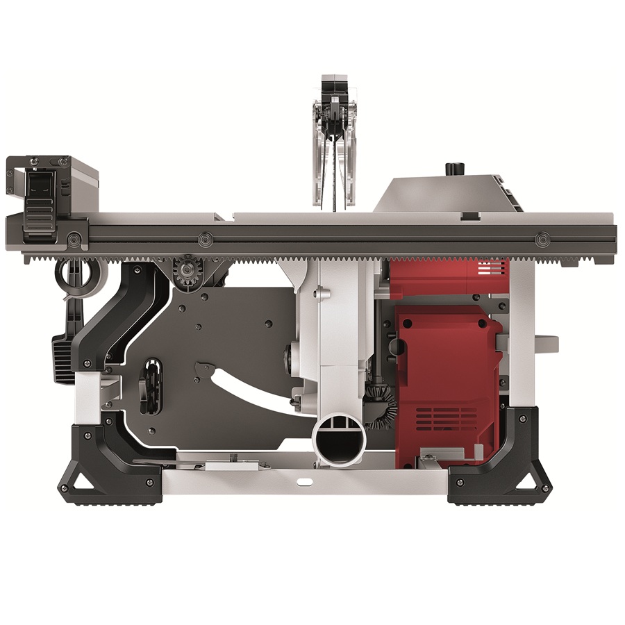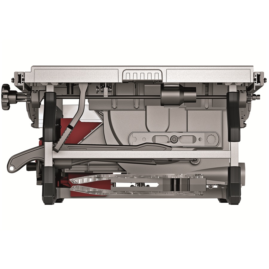 - All attachments such as angle and parallel fence, push stick, protective cover, anti-kickback device, tool spanner and Allen key can be stowed under the table for transport
