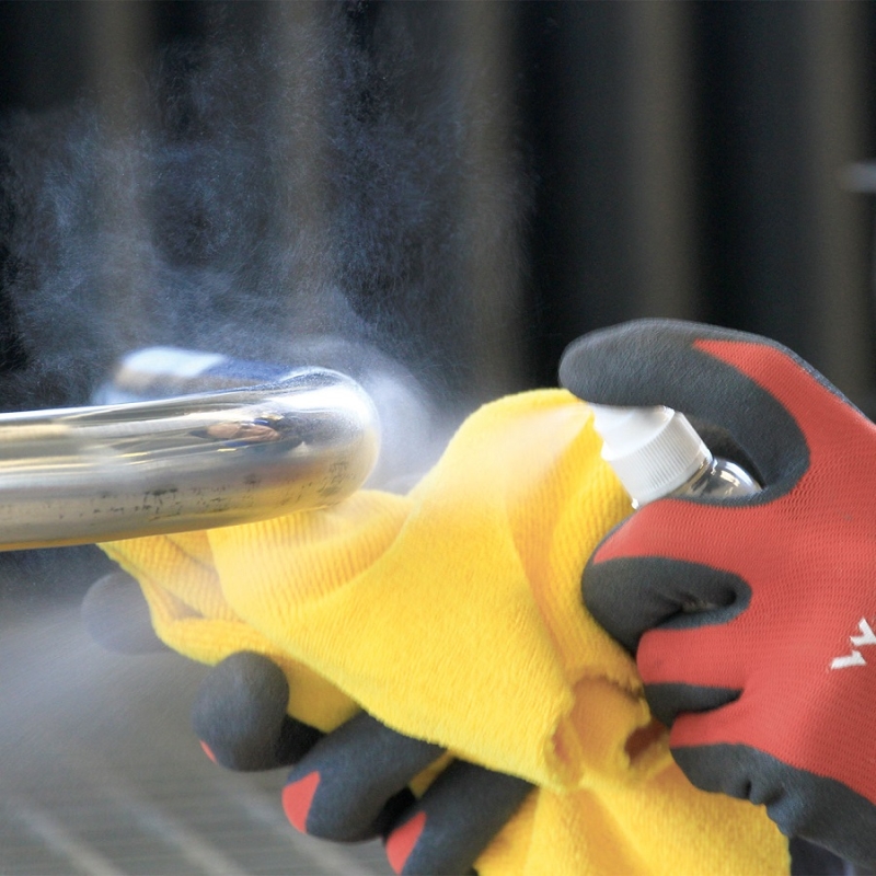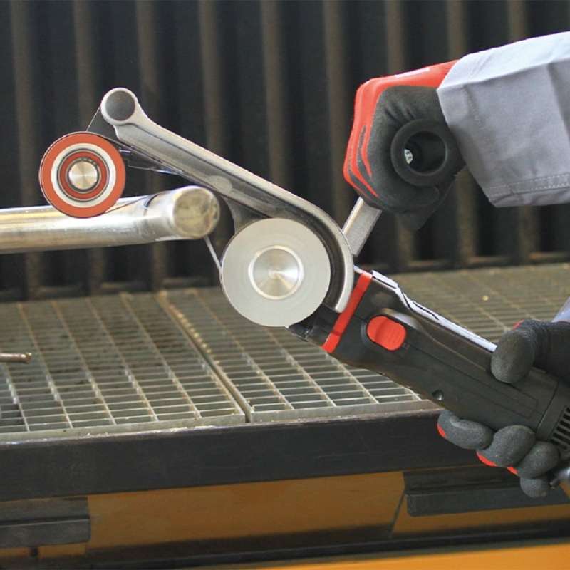 A variable speed range from 550 to 2,000 rpm with tacho-generator for constant speed even under load. Homogeneous, uniform grinding and polishing results for all pipe diameters, large and small. Drive roller with replaceable rubber O-rings guarantees no-slip belts running. Ideal belt guide thanks to the lateral stainless steel flanges. No more adjustments required. With planetary gear, giving it the power of a plug-in machine of ~1,600 watts. Balanced and vibration-damping rubber ball handle reduces strain on the user. The belt unit of gravity die-cast aluminium is particularly robust and resistant.